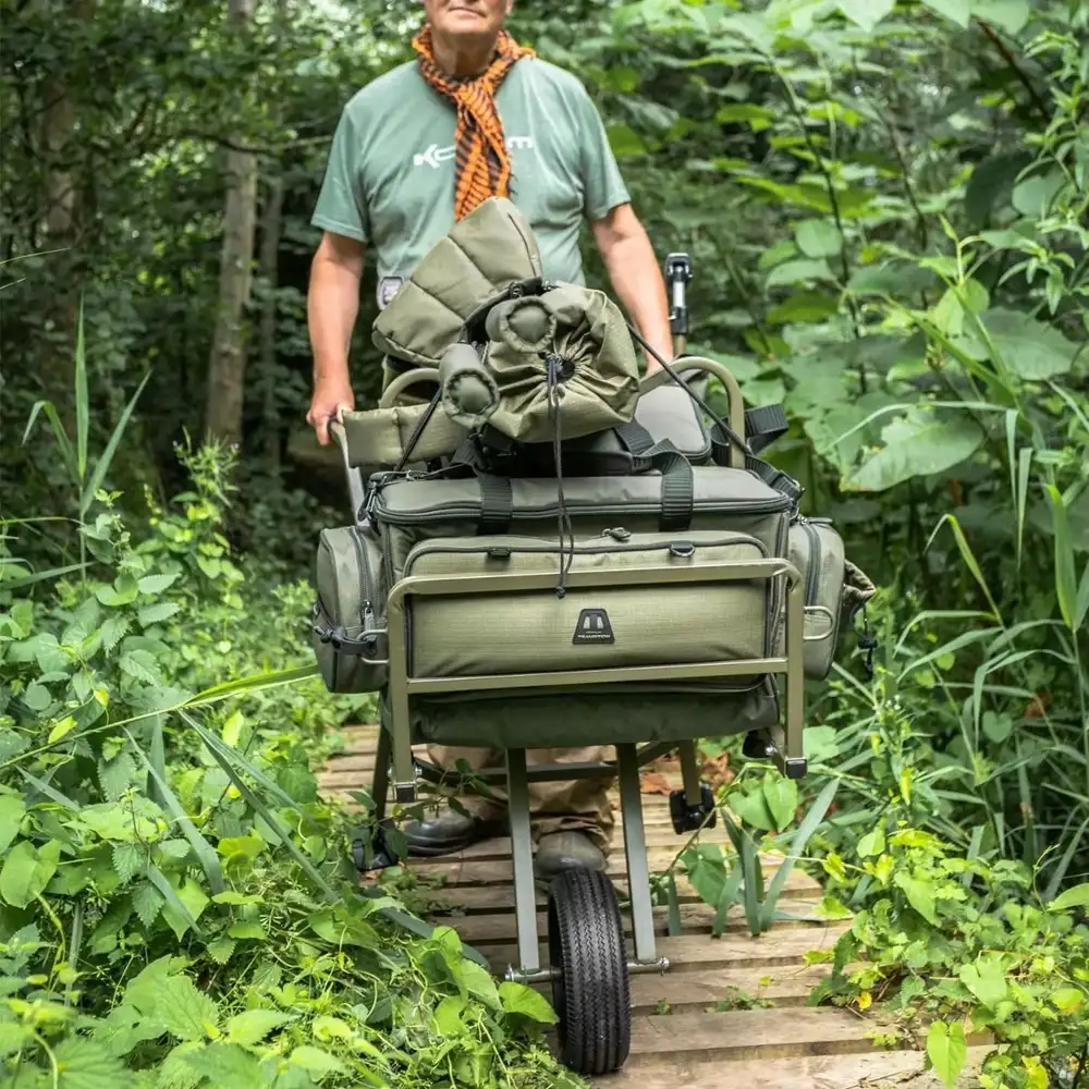 Korum ist stolz darauf, seine bisher tragbarste und effizienteste Schubkarre vorzustellen, perfekt für Angler, die ihre Ausrüstung schnell und effektiv transportieren wollen. Das Alleinstellungsmerkmal dieser speziellen Karre ist, dass sie es Anglern ermöglicht, das Gewicht ihrer Ausrüstung über das Rad hinaus zu verlagern, wodurch das Gewicht beim Anheben massiv reduziert wird.